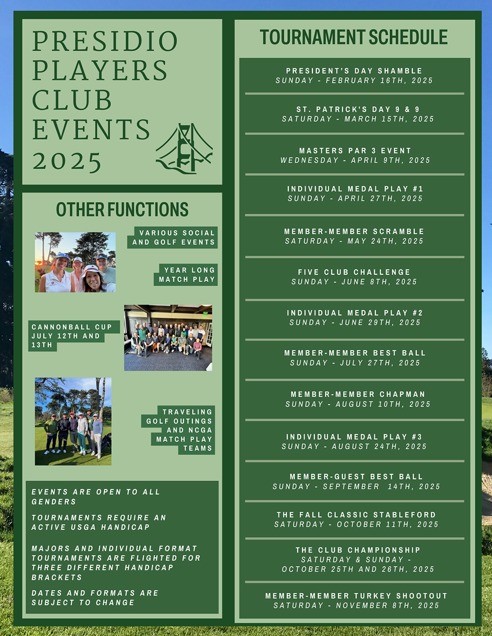 - Season-long calendar of tournaments, afternoon leagues, social events, instructional clinics, and more.