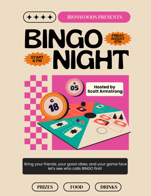 REGISTER HERE Get ready for an exciting evening of classic bingo fun at Ironwoods Bar & Grill! No entry fee, just good times, great prizes, and even better company. Whether you're a seasoned pro or brand new to the game, everyone’s welcome to join in on the action. Date & Time: August 8th at 6:00 […] |